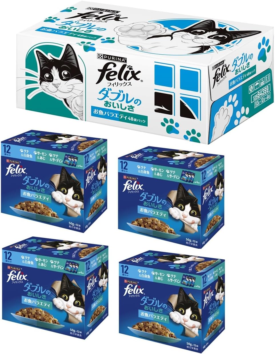 2798円が50円!フィリックスパウチ ダブルのおいしさ お魚バラエティ(ツナ&白身魚、サーモン&あじ、ツナ&サーディン) 50gx48袋入り(12袋x4箱)【Amazon.co.jp限定】 #タイムセール #特価 #PR