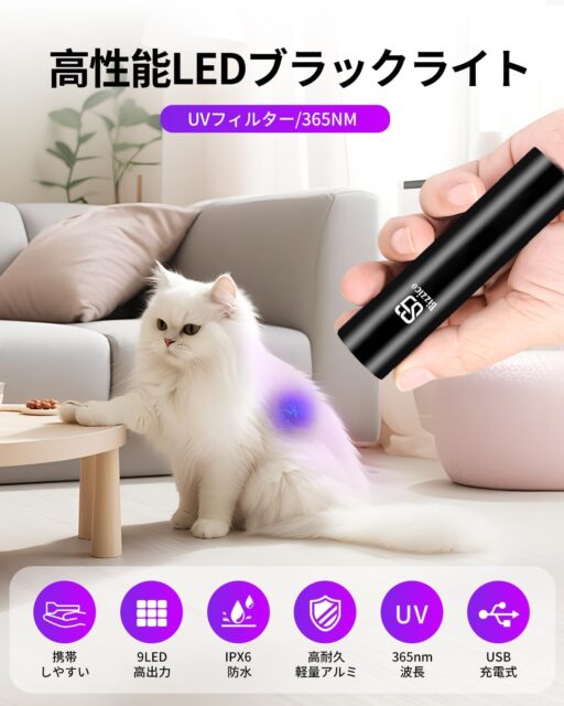 Amazonにて「HUHIK Black Light, UV Flashlight, 2025 Enhanced Version, UV Light, UV Light, Wavelength 365 nm, Built-in Battery, USB Rechargeable, Small Size, Resin Curing Light, Pet Urine Detector, Minerals,」が特価