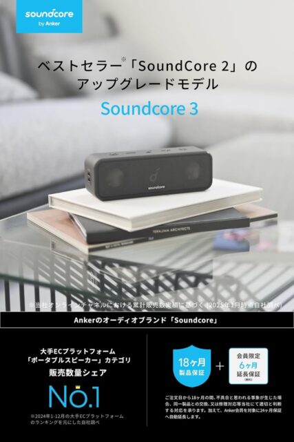 Amazonにて「Anker Soundcore 3 Bluetooth Speaker/IPX7 Waterproof/Titanium Driver/Dual Passive Radiator/BassUp Technology/APP Compatible/Equalizer Settings/USB-C Connection/24 Hours Continuous Playback/PartyCast」が特価