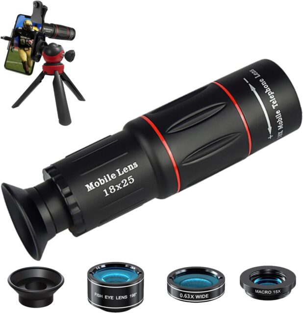 Amazonにて「4 in 1 Smartphone Telephoto Lens Set, HD 18x Monocular, Small Telescope, iPhone Compatible, Portable Telephoto Lens [18 x Telescope/Wide Angle Lens/Macro Lens/Fisheye Lens] Premium Prism Bak4 Ultra」が特価