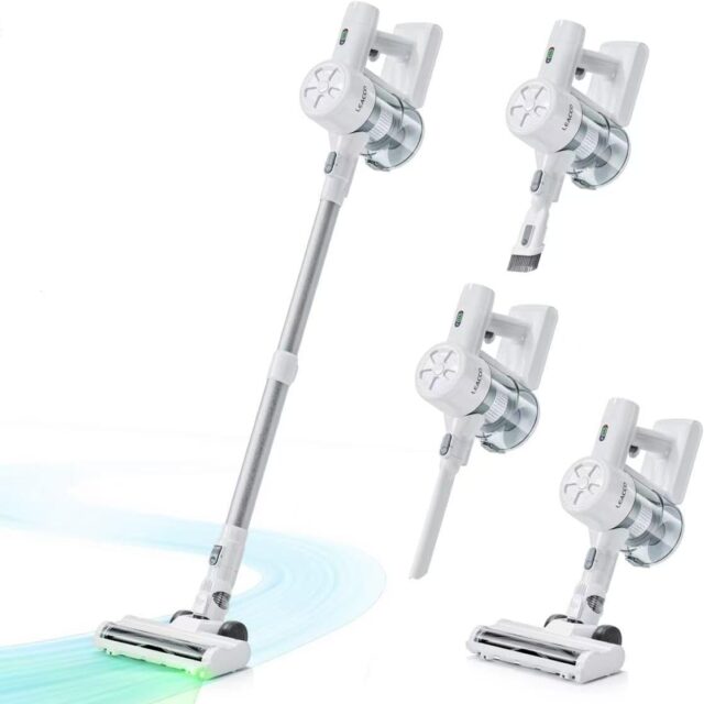 Amazonにて「LEACCO Cordless Vacuum Cleaner, 42,000 Pa, Freestanding, Lightweight, Cleaning Cyclone, 3 Levels of Suction, 45 Minutes of Operation, Stick Vacuum Cleaner, LED Light, Telescopic Pipe, Stick Cleaner」が特価