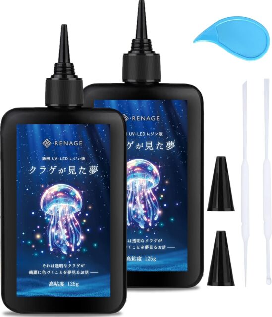 Amazonにて「RENAGE Resin Liquid UV LED, Large Capacity, 4.4 oz (125 g), Transparent, Hard Type, High Viscosity, Jellyfish Dream, Clear, Includes Opener and Nozzle Cap Included, Full Color Instruction Manual (Set」が特価1980円で販売中です。