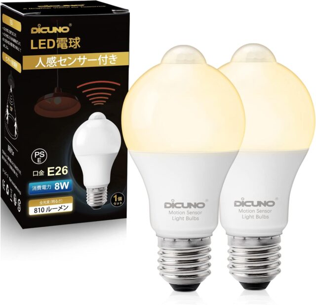 Amazonにて「DiCUNO LED Light Bulb, E26 Base, Motion Sensor, 8W Equivalent, 60 Shapes, 810 lm Light Bulb Color, 2,700K, Light and Dark Sensor, Infrared Sensor, Automatic Lighting, High Brightness, Non-Dimmable,」が特価1699円で販売中です。