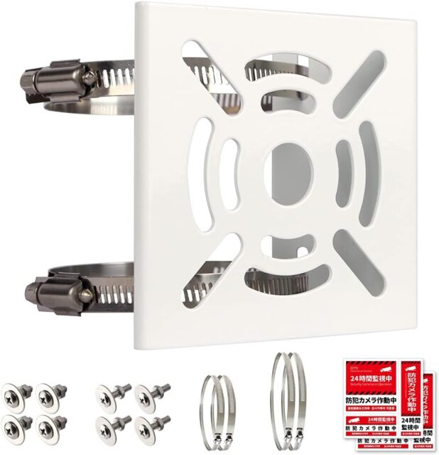 Amazonにて「Mounting Bracket, Pole, Security Camera, Bracket, Stand, Housing, Cylindrical Column, Ready to Use Full Set, 4 Stainless Steel Bands, 4 Bolts Set, 2 Security Stickers Included」が特価1182円で販売中です。