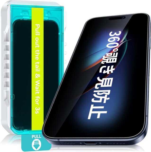 Amazonにて「Esanik 360° Anti-Spying, Compatible with iPhone 16 Pro, Set of 2, Glass Film, 4-Way Spy Prevention, Protective Film, Automatic Positioning Box, No Slipping, Easy to Apply, Tempered Glass, 9H Hardness」が特価