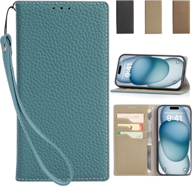 Amazonにて「iPhone 16 Case, Premium Genuine Cow Leather Case, Folio Case for iPhone 16, Genuine Leather, Phone 16 Cover, Stand Function, Strap, Magnetic Card Pocket, Gift Box Included, Blue x Gray」が特価1904円で販売中です。