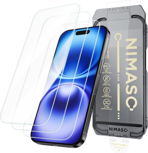 Amazonにて「NIMASO DSP25L2016 Glass Film for iPhone 16 / iPhone 15, Tempered Glass, Automatic Dusting, Bubble Free, Protective Film, Easy to Apply, Shockproof, Anti-Fingerprint, with Guide Frame, 3 Piece Set for」が特価