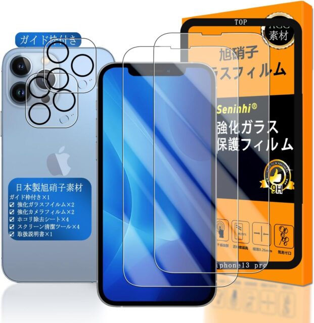 Amazonにて「Compatible iPhone 13 Pro Glass Film with Guide Frame for 6.1 inch Apple iPhone 13 Pro Film (2 Pieces) + Camera Film (2 Pieces) + Guide Frame) IPHONE 13 Pro Tempered Glass LCD iPhone 13 Pro Protective」が特価629円で販売中です。