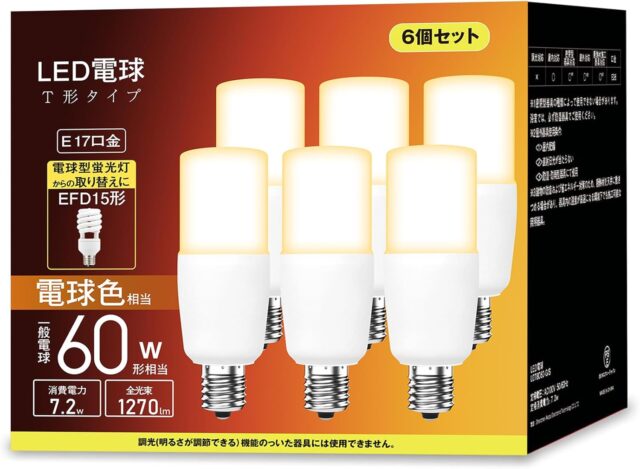 Amazonにて「LED Light Bulb, T Shape, E17 Base, 60W Equivalent, Bulb Color, 1270LM (7.2W) Compatible with Insulation Installation, Omnidirectional Type Fluorescent Bulb, EFD25 / EFD15 Alternative Type, For」が特価